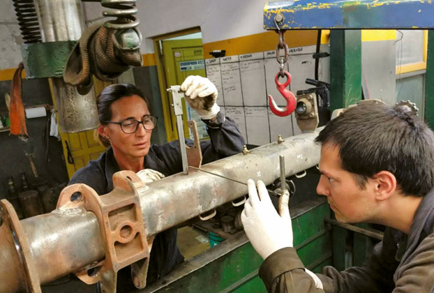 “Mi papá desarrolló un sistema único de reparación sin desarmar, de puntas de cañoneras: consiste en cortar la punta, donde se alojan los bolilleros, que por algún motivo se deterioraron con un torno portátil que el mismo inventó en el año 1976; que agranda o rectifica la manga de cañonera, luego se hace de cero la puntera con material virgen, se tornea dsicha puntera, se calienta, se clava, se suelda y se arma ¡y así queda como recién salido de fábrica! Solo desarmo la rueda y el plato de freno. Las punteras que reparamos acá tienen una vida útil de 10 a 12 años según el mantenimiento y el trato que se les dé.”