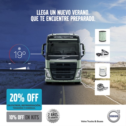 A partir del 1 de octubre y hasta el 31 de diciembre del 2020, los clientes de Volvo pueden acceder a un descuento del 20% en la compra de los siguientes repuestos: filtros, piezas de refrigeración, tensores y correas. Por su parte, los kits, que ya poseen un precio especial por conjunto de piezas, la misma promoción contempla un 10% de descuento en Kits de esas mismas familias, que se acumula a la promoción vigente de financiación en 6 cheques.