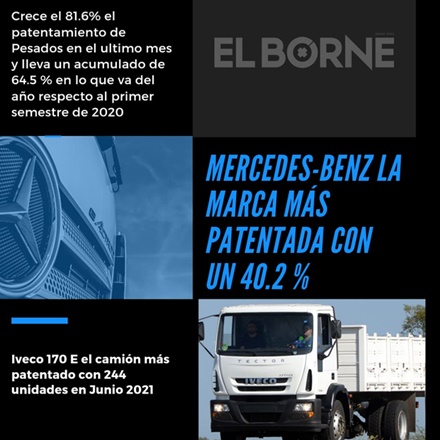 Mercedes Benz resulta ser la marca más patentada con un 40.2% mientras que el Iveco 170E, está entre los modelos de camiones más vendidos con 244 unidades según el informe de patentamientos del mes de Junio 2021. El acumulado en lo que va del año es de un 64.5% con respecto al primer semestre del 2020.-