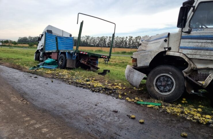 Un Iveco con acoplado cargado con limones chocó por detrás a un Scania que transportaba carbón, que a su vez fue a dar contra otro Scania también con carbón, ambos detenidos sobre la banquina.
