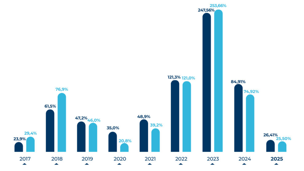 Con este nuevo valor, el ICT alcanza un incremento acumulado de 26,4% en lo que va del año (enero-septiembre 2025), mientras que la variación interanual asciende a 33,2%, tras cerrar 2024 con un alza del 84,9% y haber registrado en 2023 el mayor aumento de los últimos 30 años (248%).