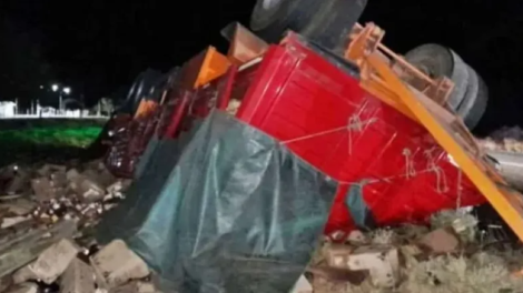 Un camión que transportaba botellas de vidrio y envases tetra pak volcó sobre la Ruta Nacional 141, a pocos kilómetros de la localidad de Chepes, en...