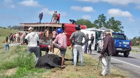 El mismo día, horas antes que el siniestro de Rosario, ocurrió uno similar: un camión jaula que trasladaba más de 50 vacas volcó en la ruta nacional...